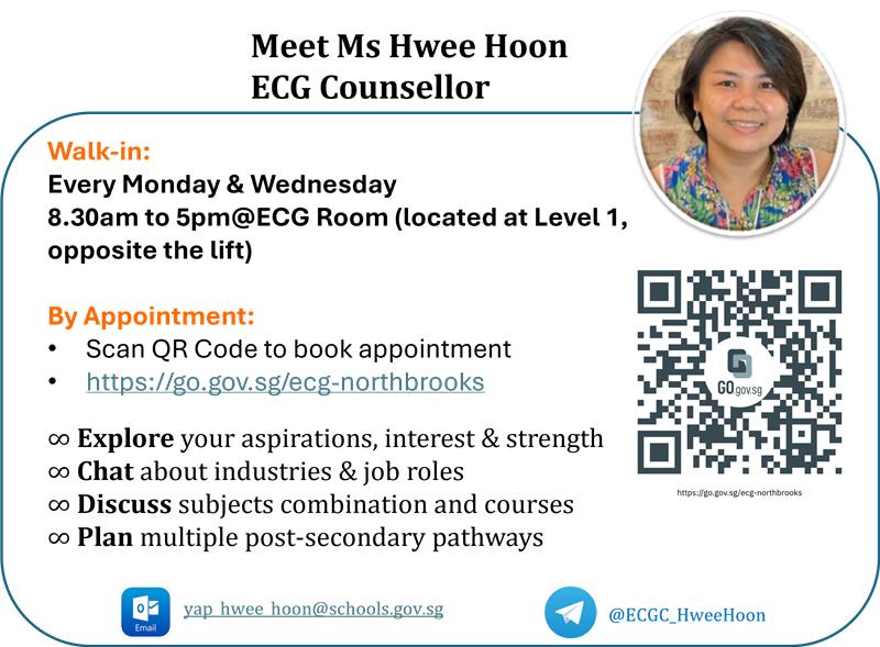 Make an appointment to discuss your interest, strength, careers interest and post-secondary possibilities https://go.gov.sg/ecg-northbrooks.